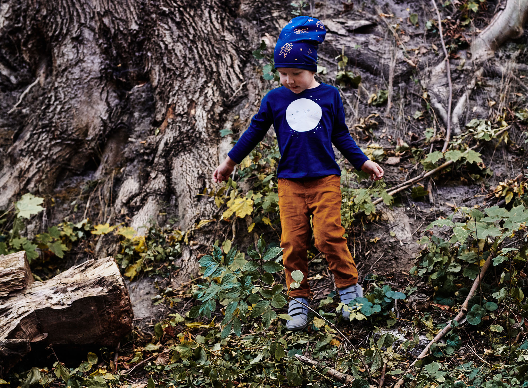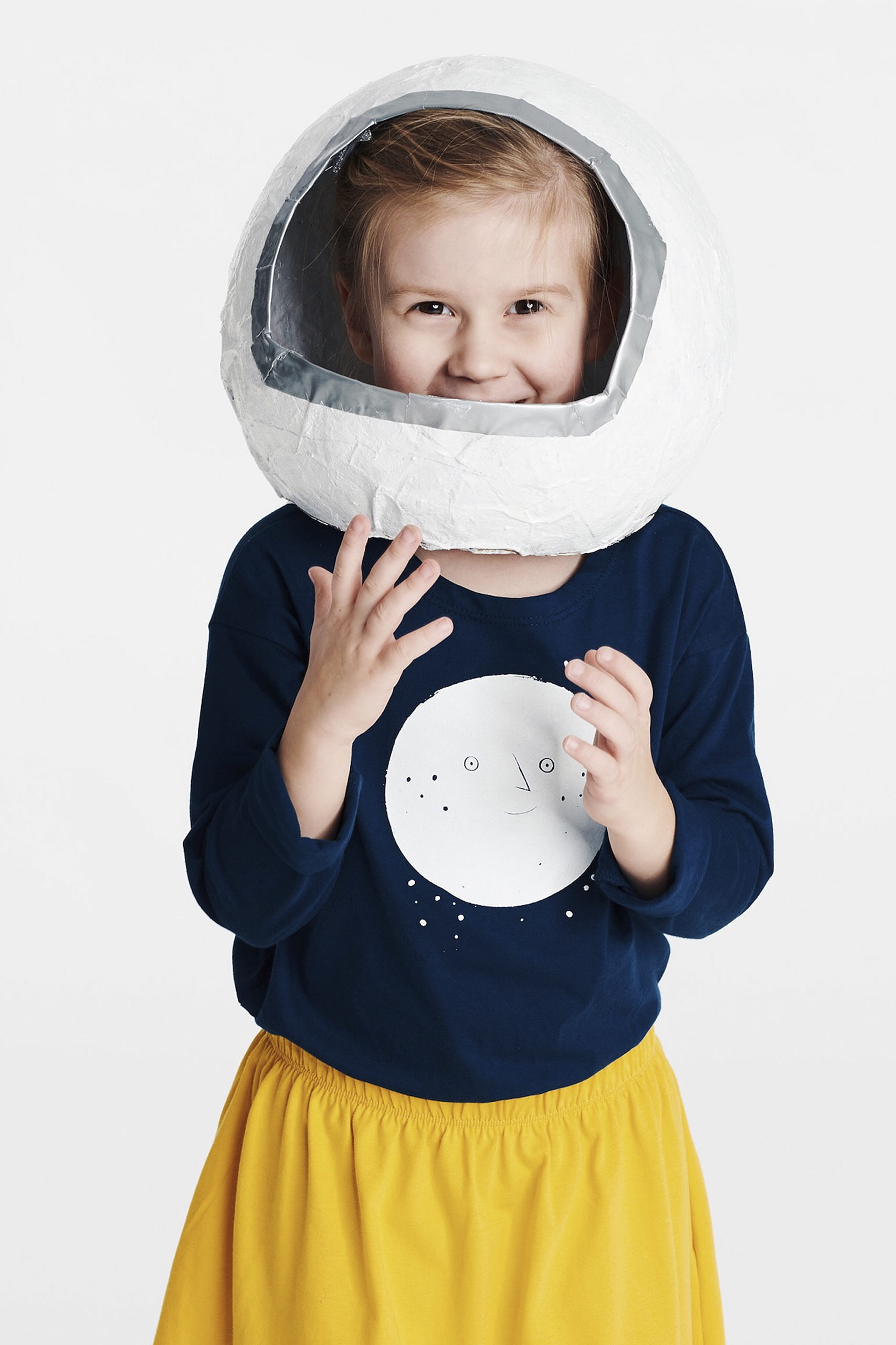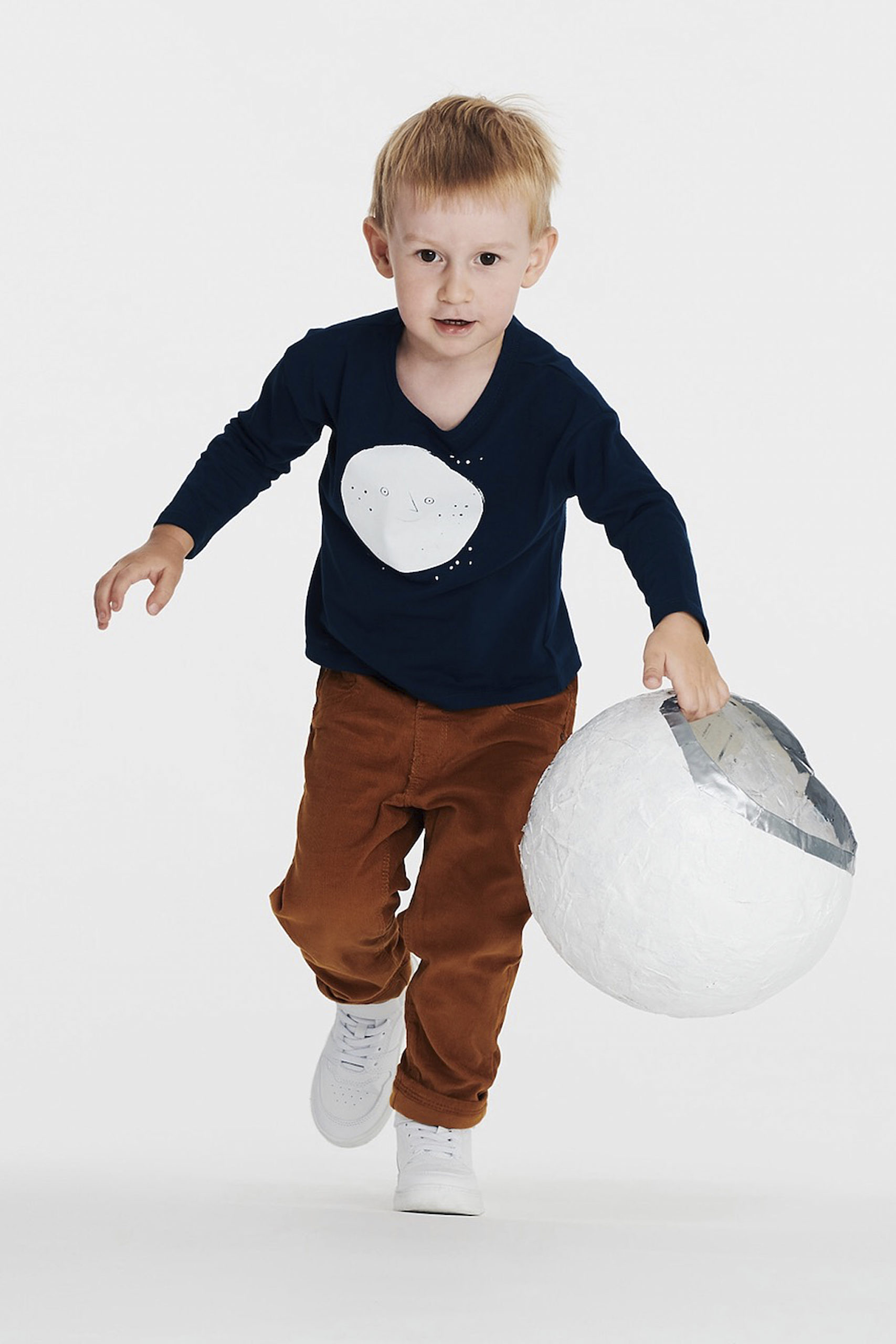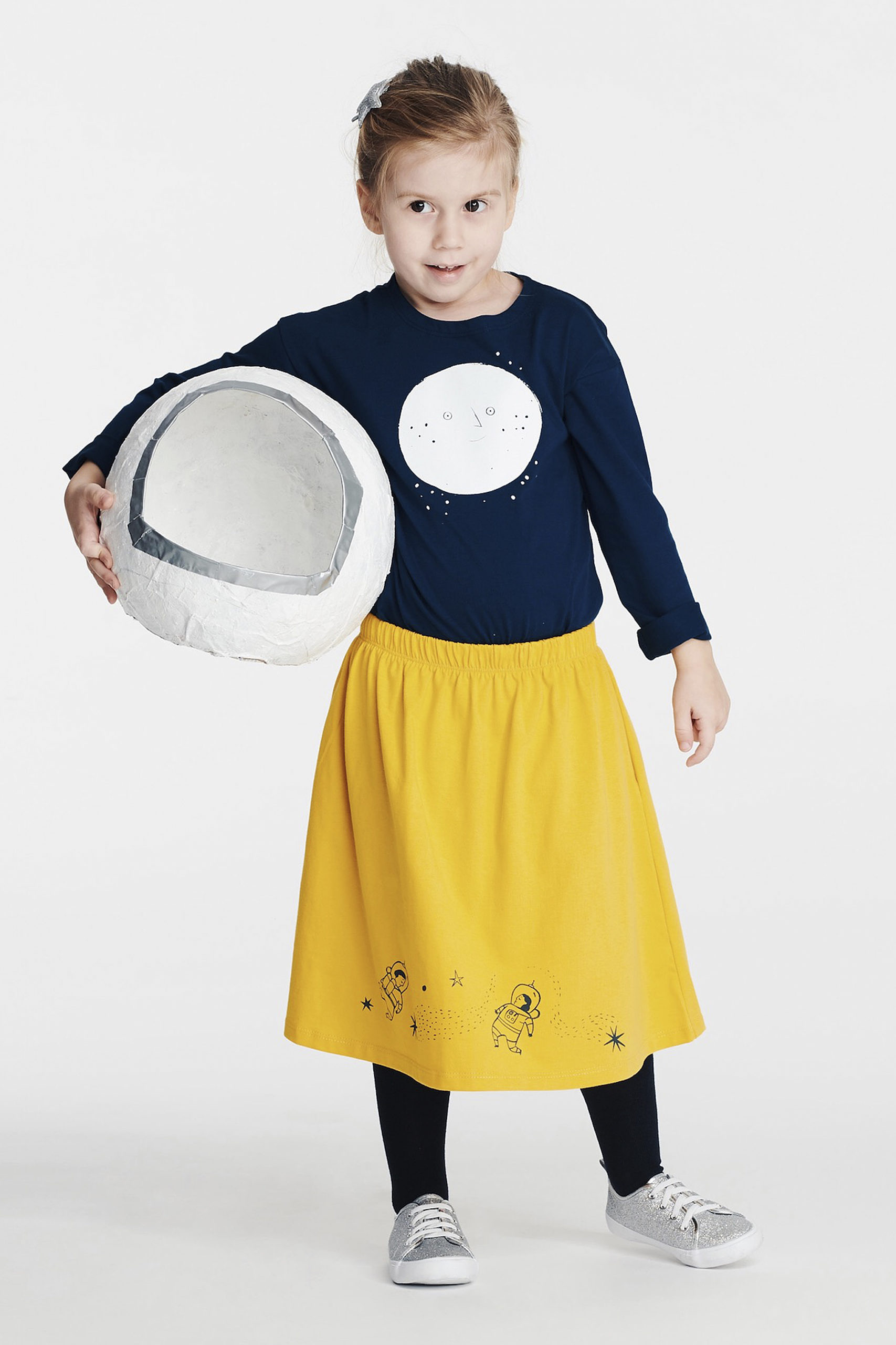 Propozycja dla małych odkrywców Kosmosu – granatowa bluzka z długim rękawem, uszyta z wyprodukowanej w Polsce dzianiny bawełnianej. Motyw Księżyca.