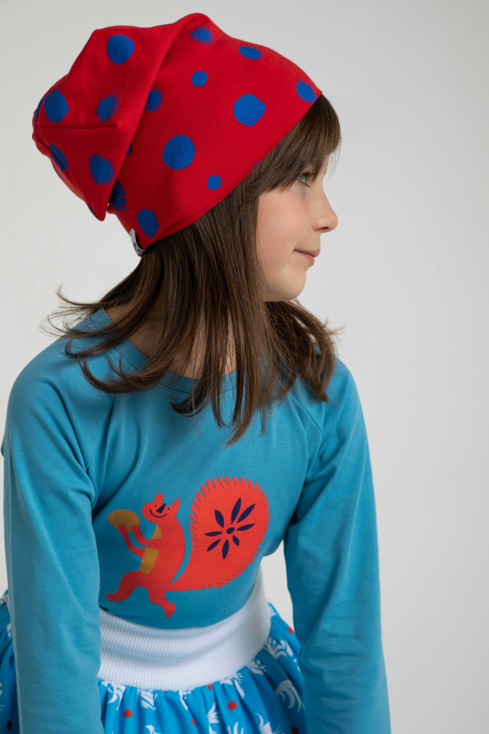 Zamiast zbierać orzeszki wprawia nas wszystkich w dobry humor. Ruda wiewiórka zdobi niebieską bluzkę z długim rękawem, którą uszyliśmy z miękkiej i miłej w dotyku bawełny. Nadruk wykonany został z bezpiecznych dla dzieci i środowiska farb wodnych.