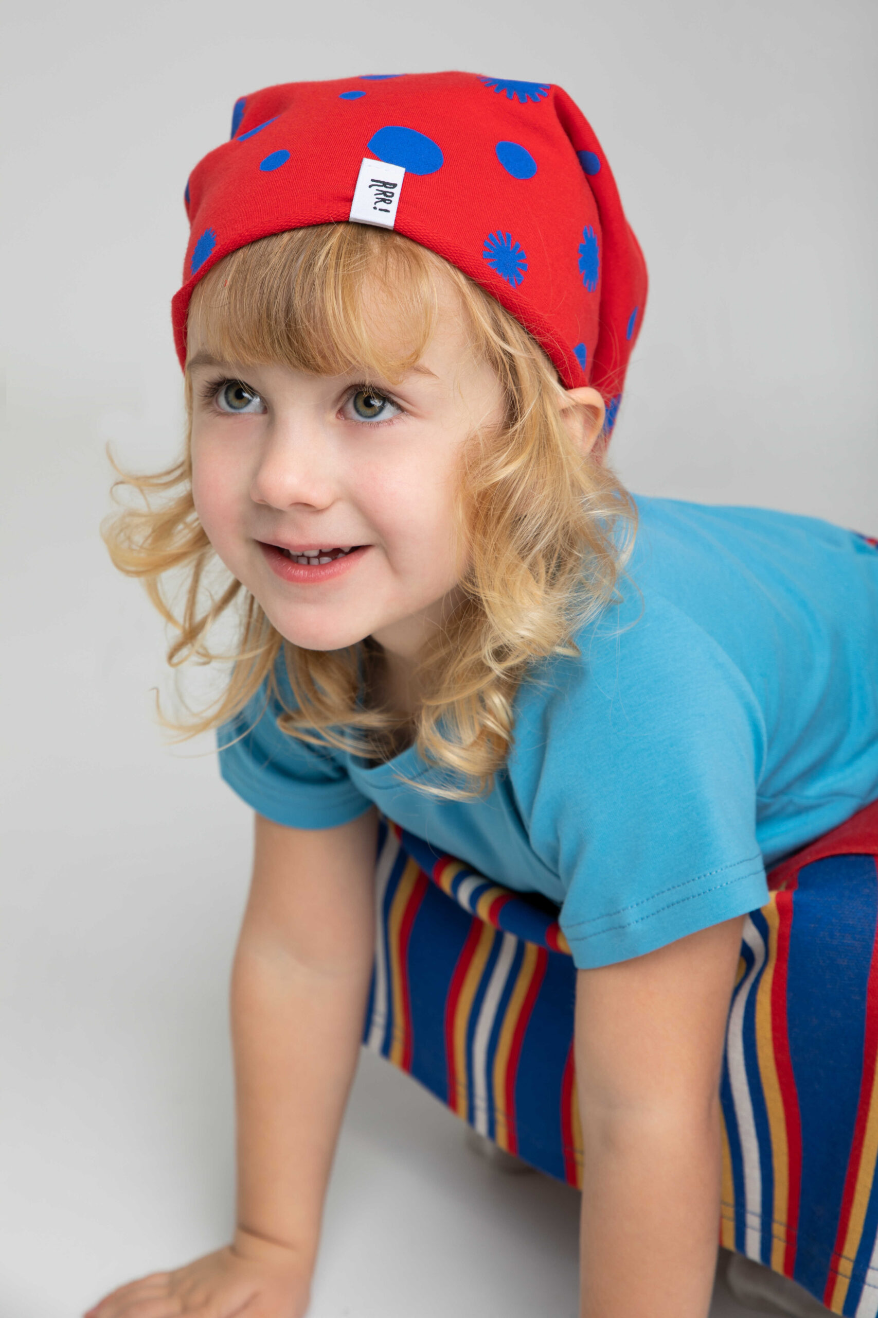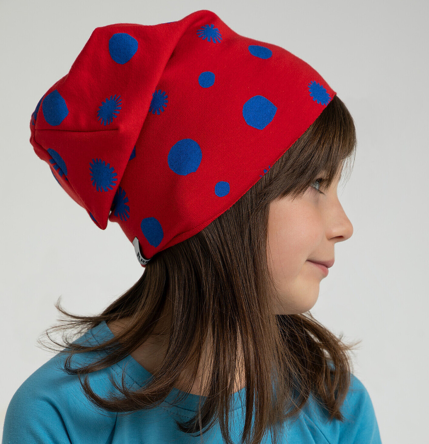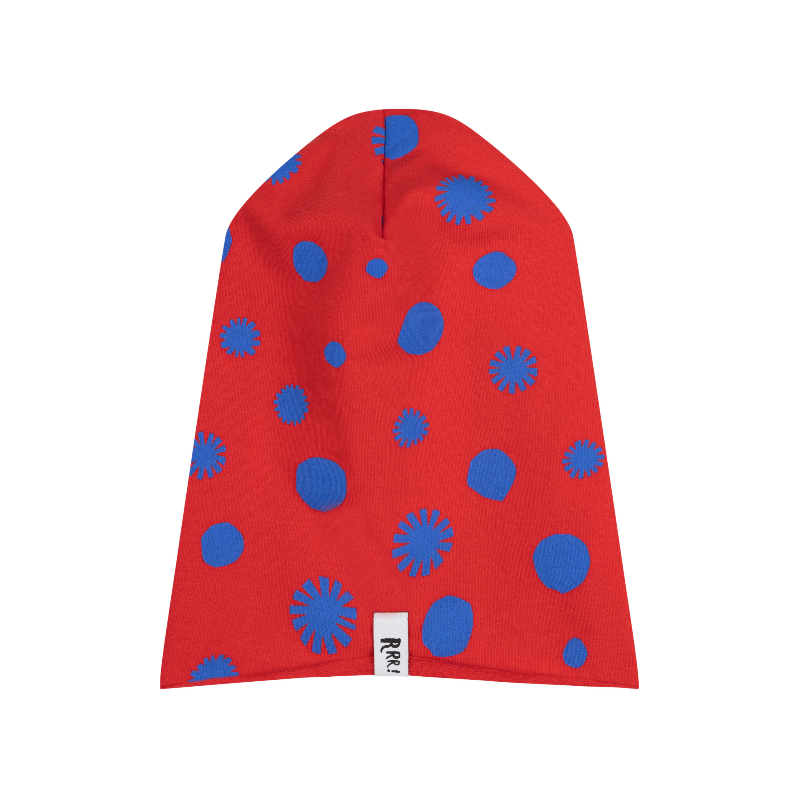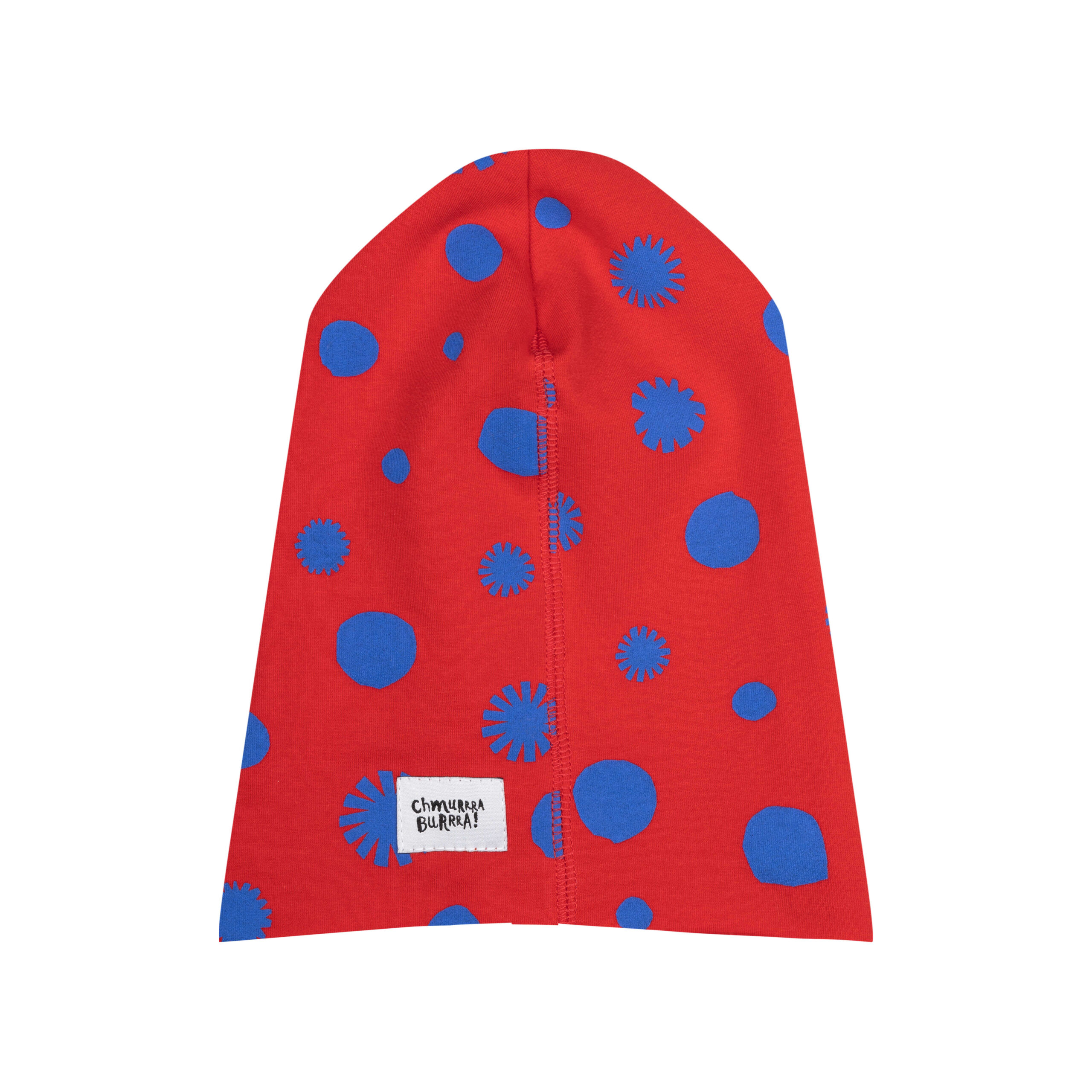 Czerwona czapka w kropki w kolorze ultramaryny może być noszona solo lub w zestawie z kominem. Uszyliśmy ją z miękkiej bawełnianej dzianiny, dzięki czemu nie drapie i jest bardzo przyjemna dla delikatnej dziecięcej skóry.