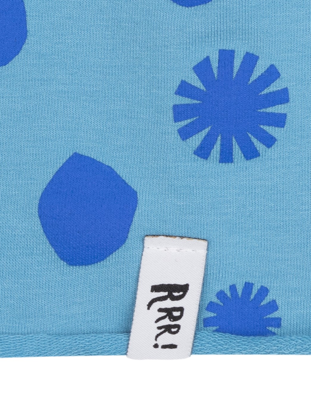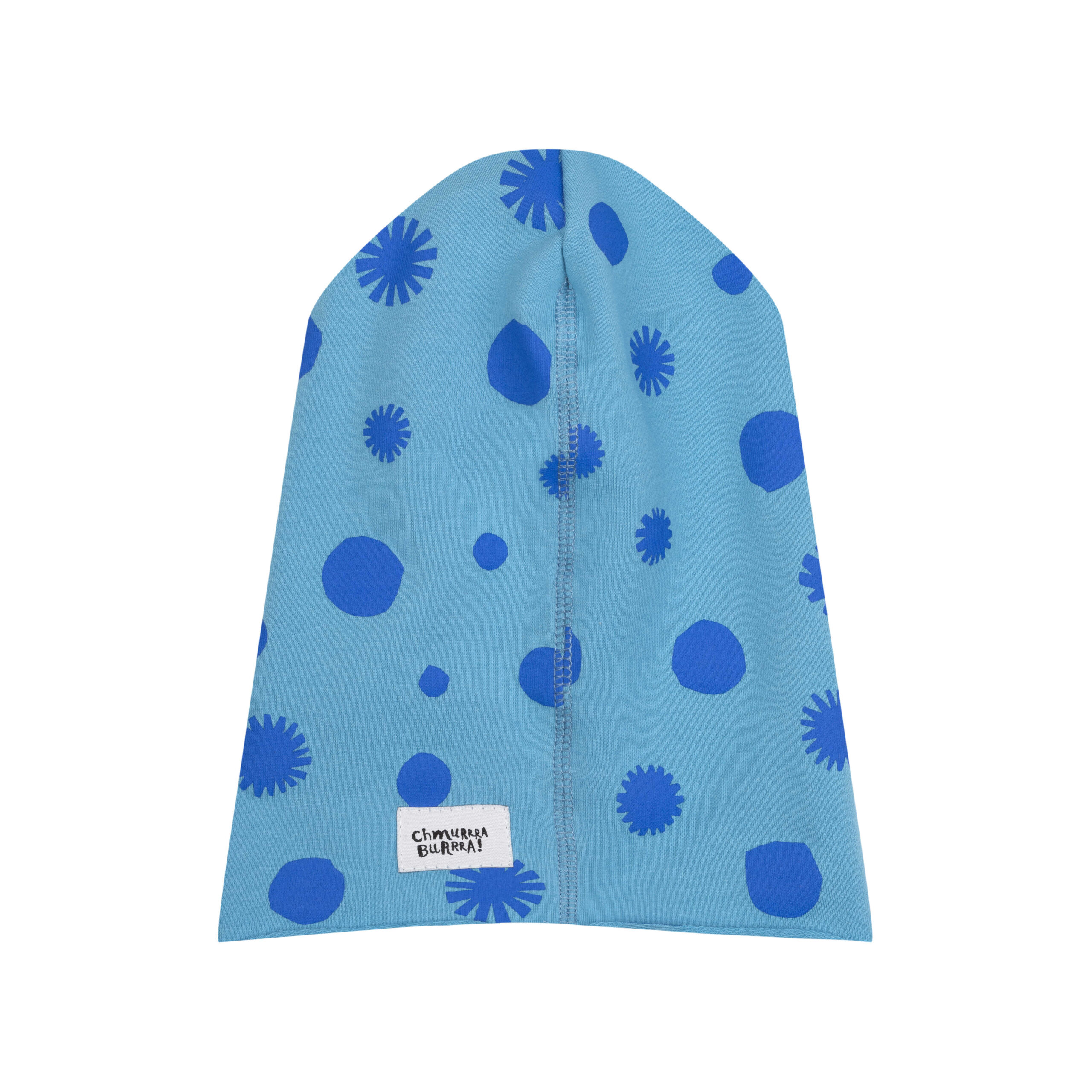 Niebieska czapka w kropki w kolorze ultramaryny może być noszona solo lub w zestawie z kominem. Uszyliśmy ją z miękkiej bawełnianej dzianiny, dzięki czemu nie drapie i jest bardzo przyjemna dla delikatnej dziecięcej skóry.