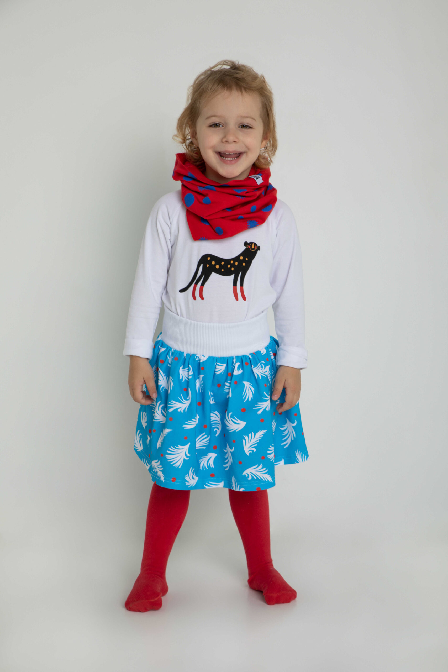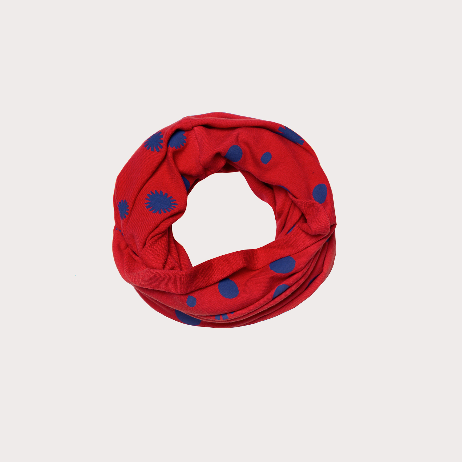 Czerwony komin w kropki w kolorze ultramaryny może być noszony solo lub w zestawie z czapką. Uszyliśmy go z miękkiej bawełnianej dzianiny, dzięki czemu nie drapie i jest bardzo przyjemny dla delikatnej dziecięcej skóry.