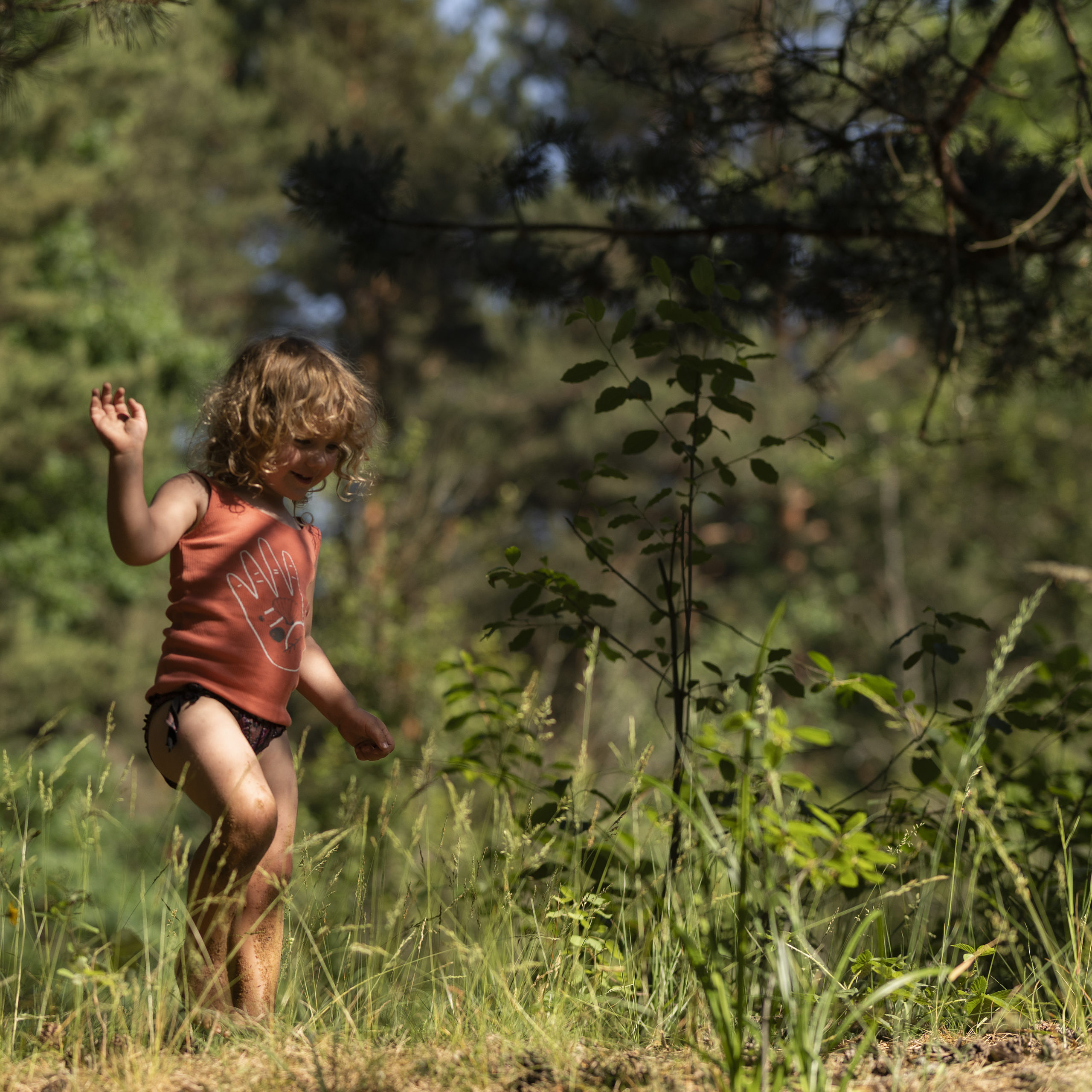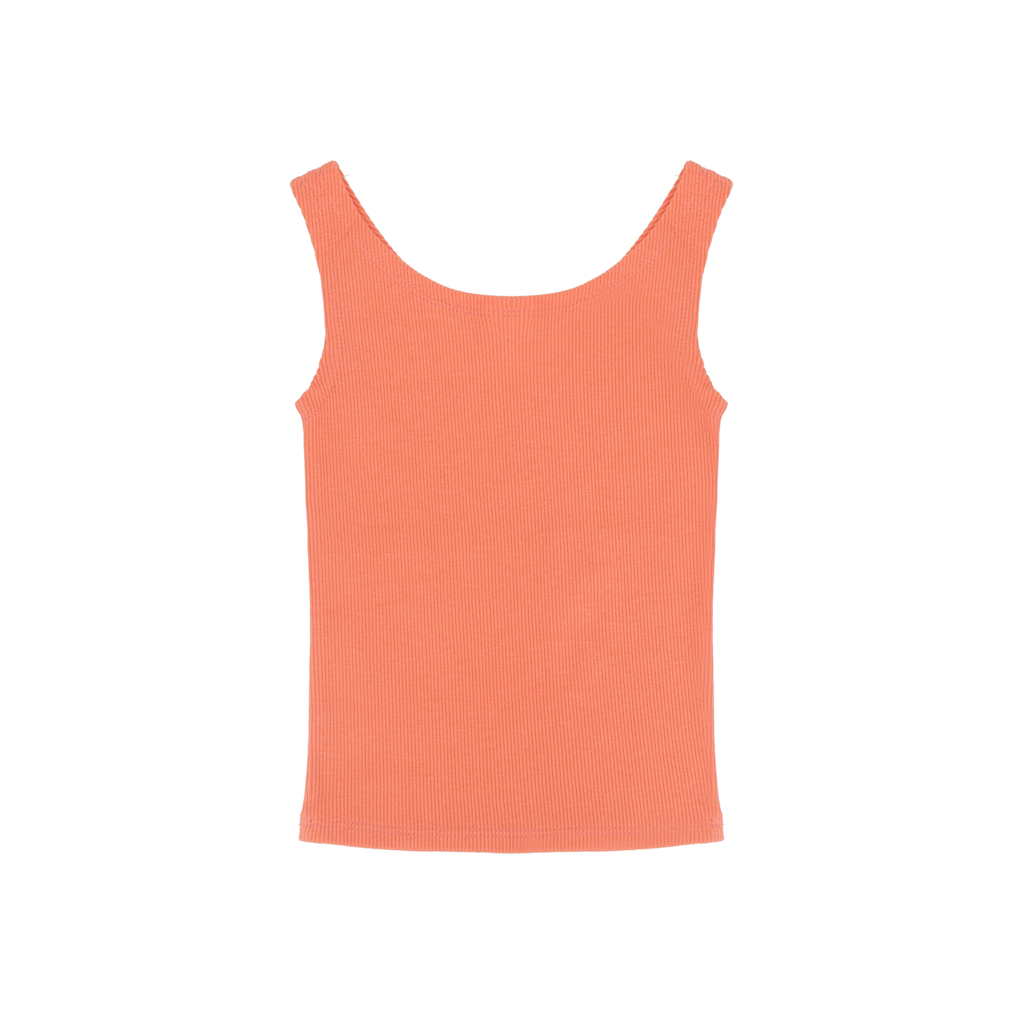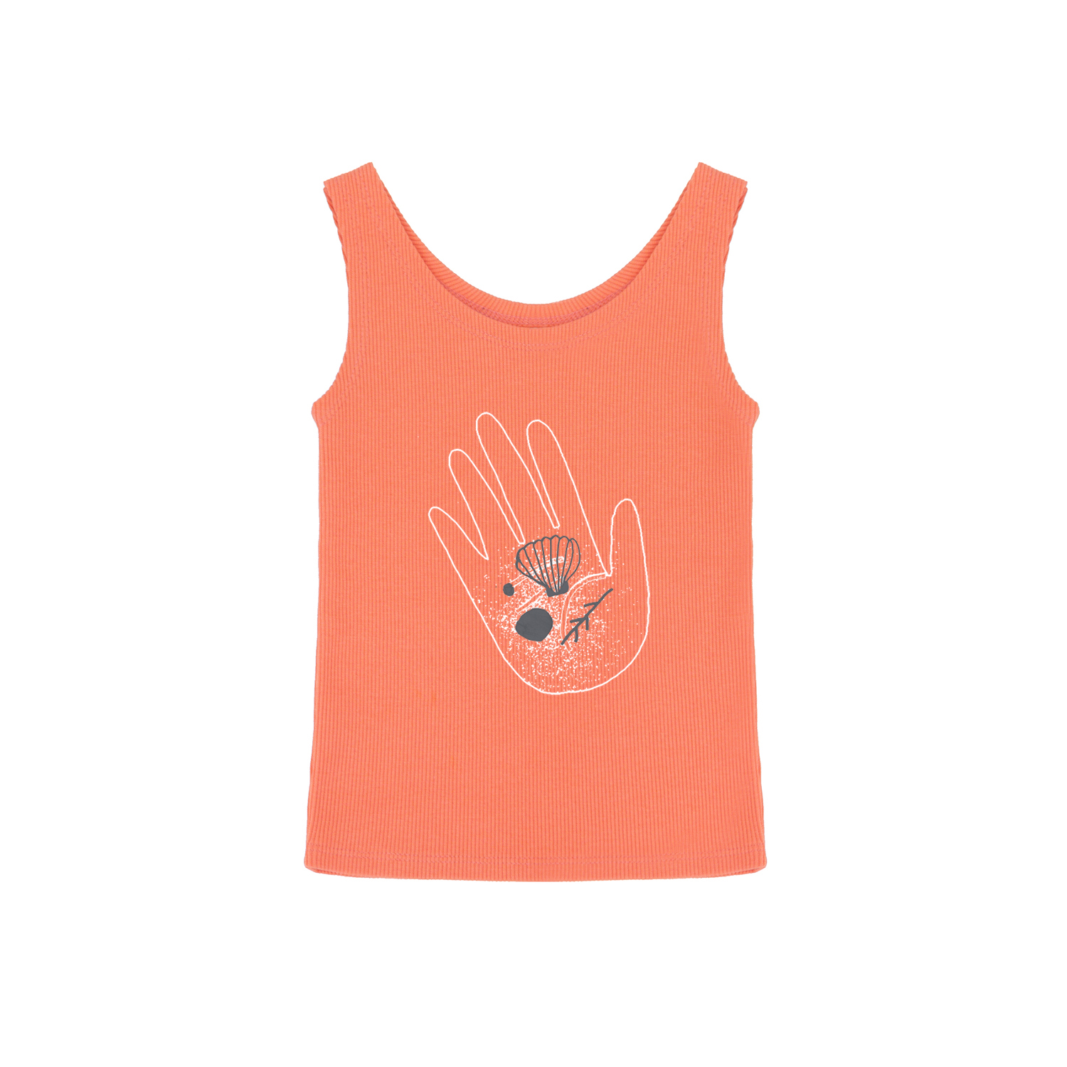 Top w żywym, koralowym kolorze. Z przodu nadruk dłoni z muszelkami.