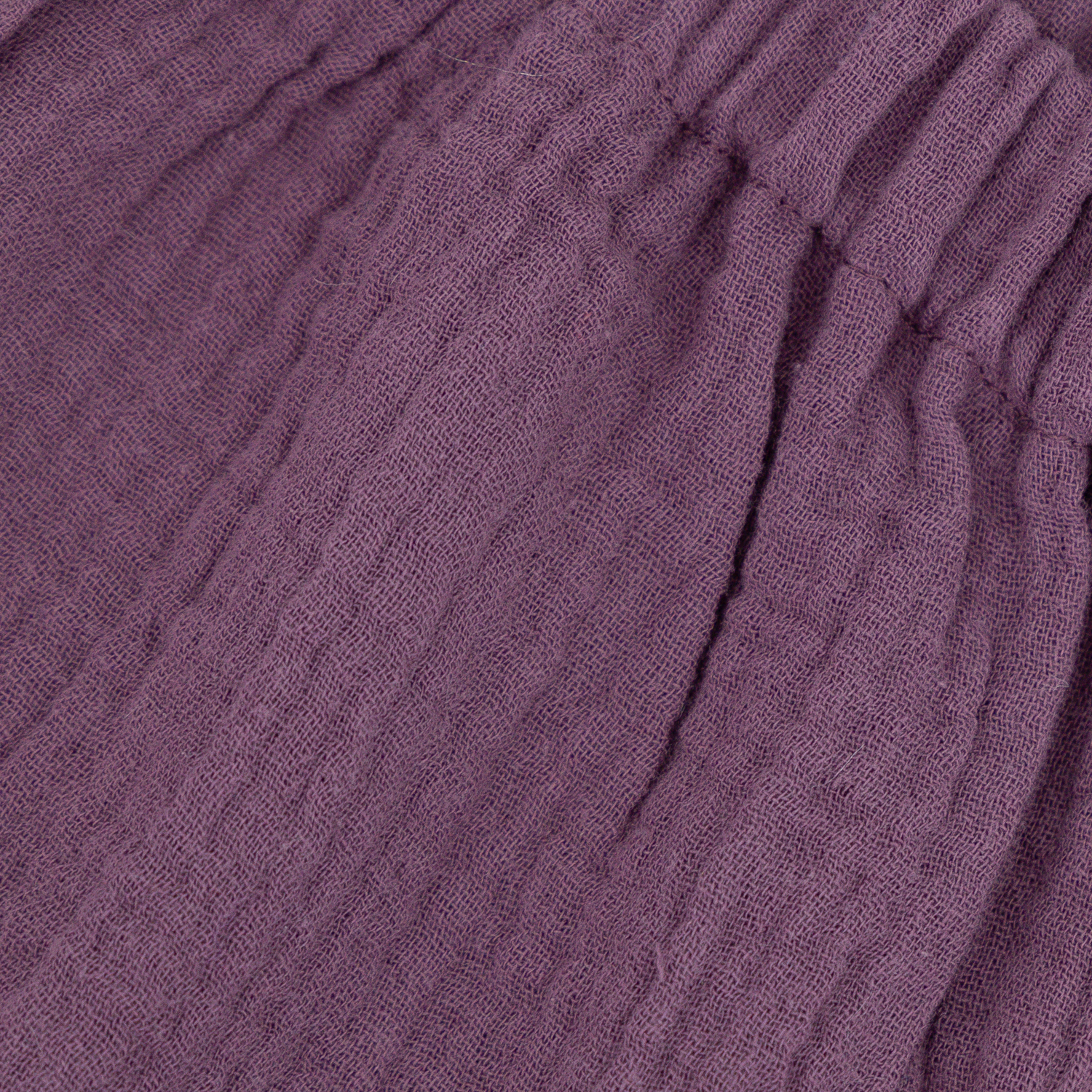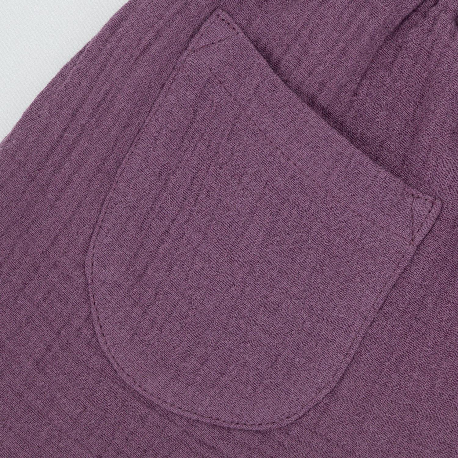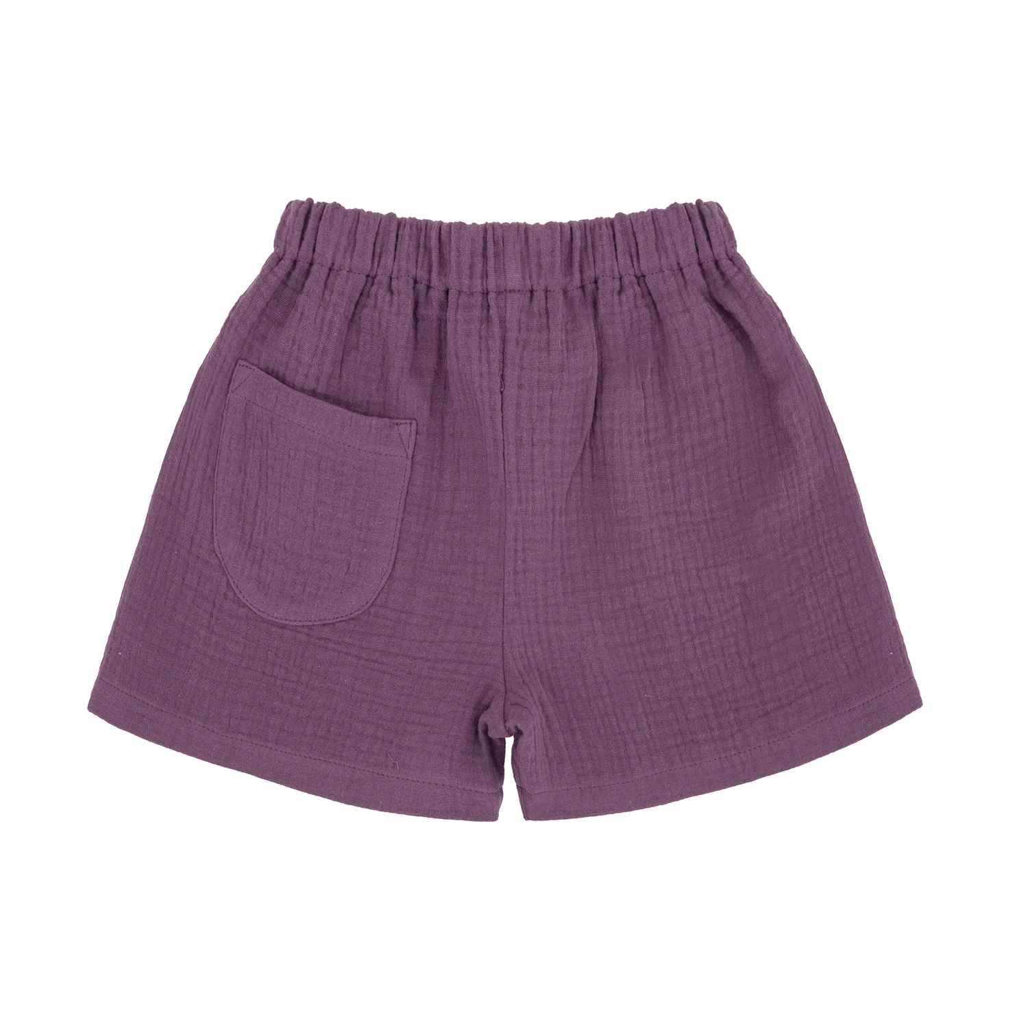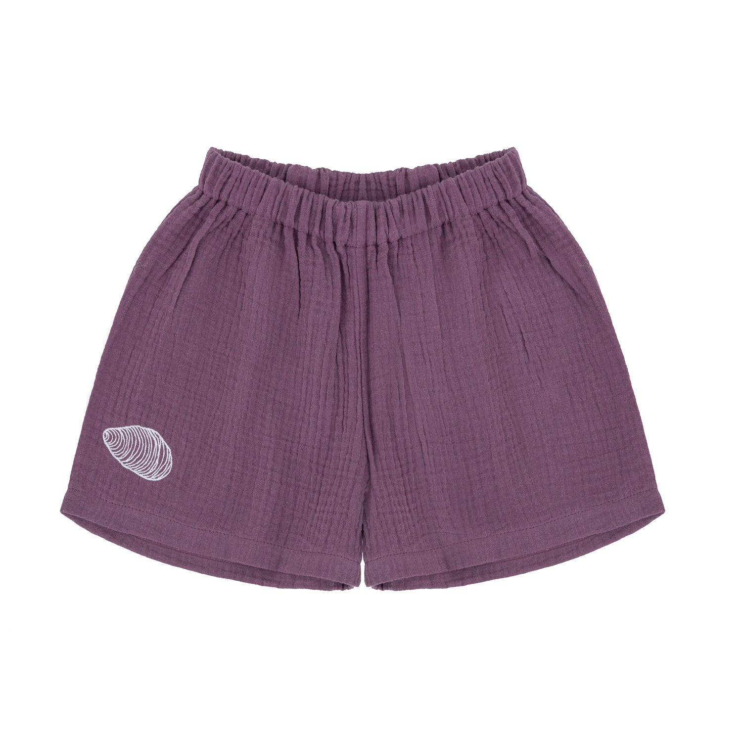 Krótkie muślinowe spodenki w pięknym śliwkowym kolorze. Na nogawce wyhaftowana muszelka. W pasie wygodna gumka, jedna gustowna kieszeń z tyłu.
