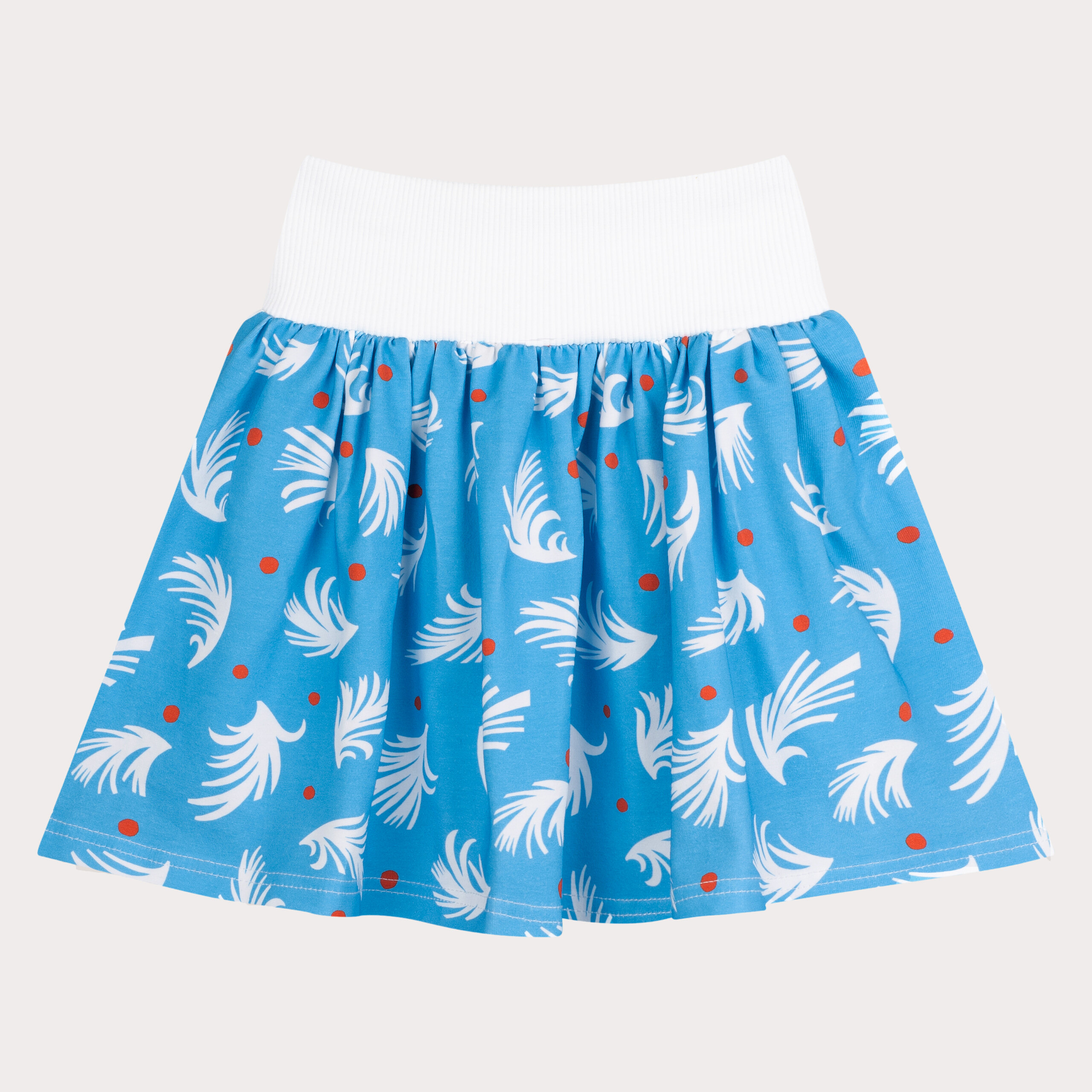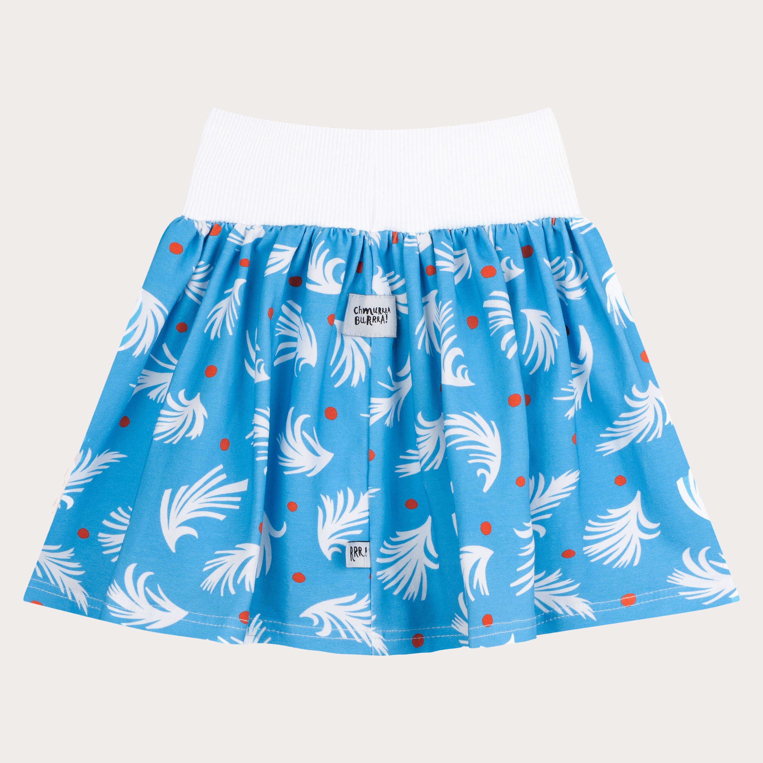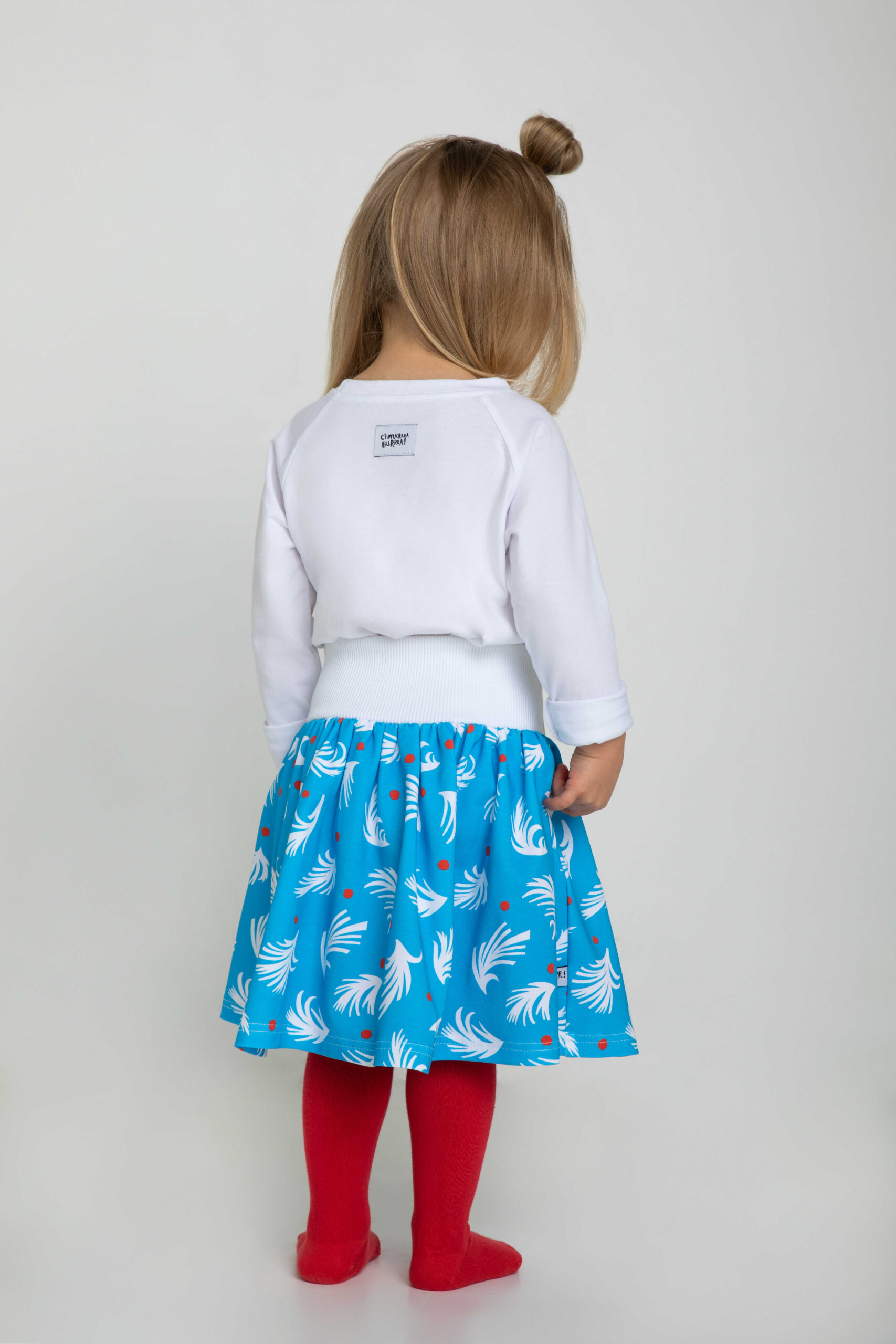 Błękitna spódniczka przed kolano lubi skupiać na sobie uwagę. Nic dziwnego, jej rozkloszowany krój jest wręcz stworzony do tańca! Spódniczka wykończona jest miękkim białym ściągaczem, który można również wywijać – co, kto lubi!