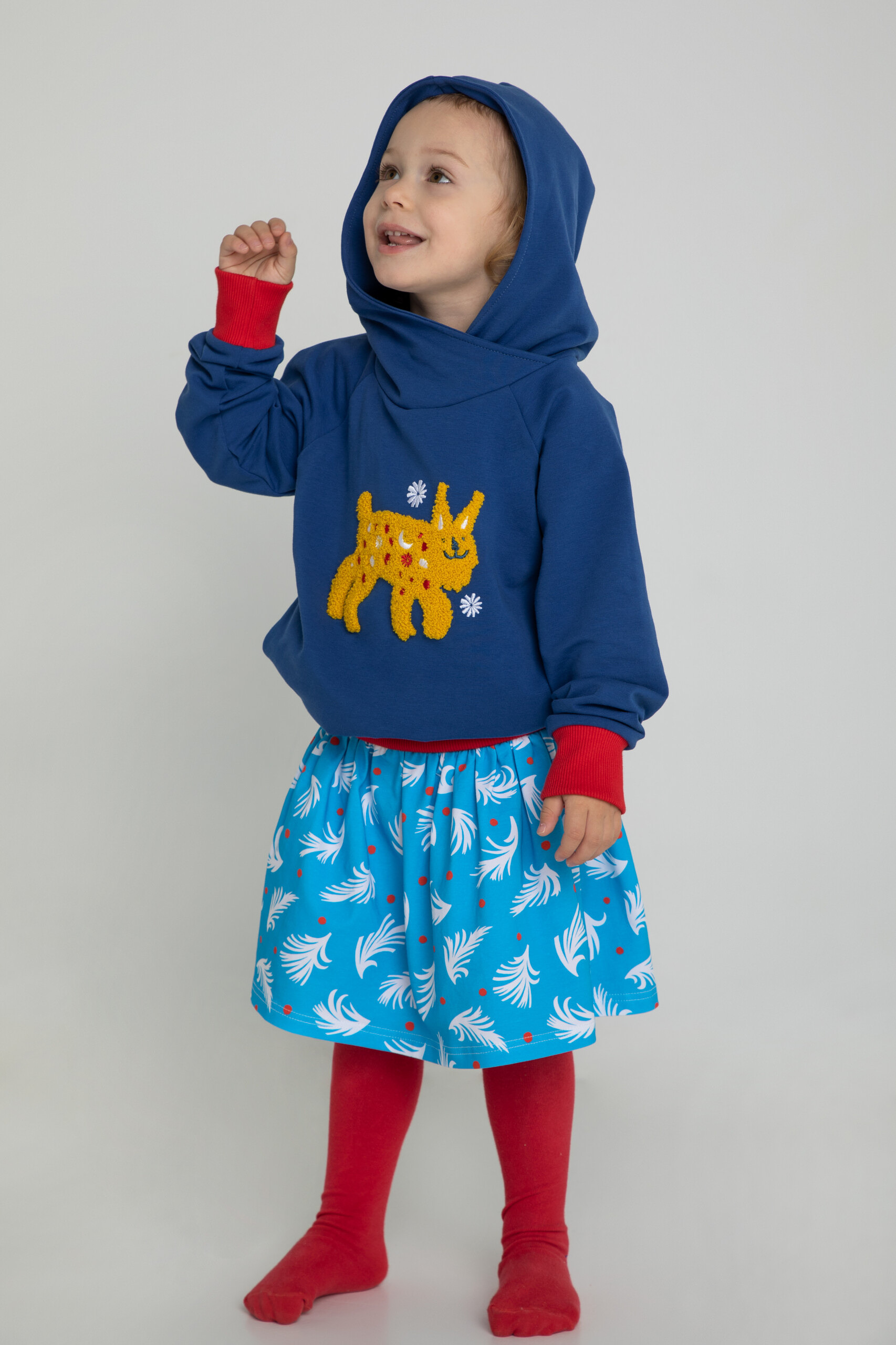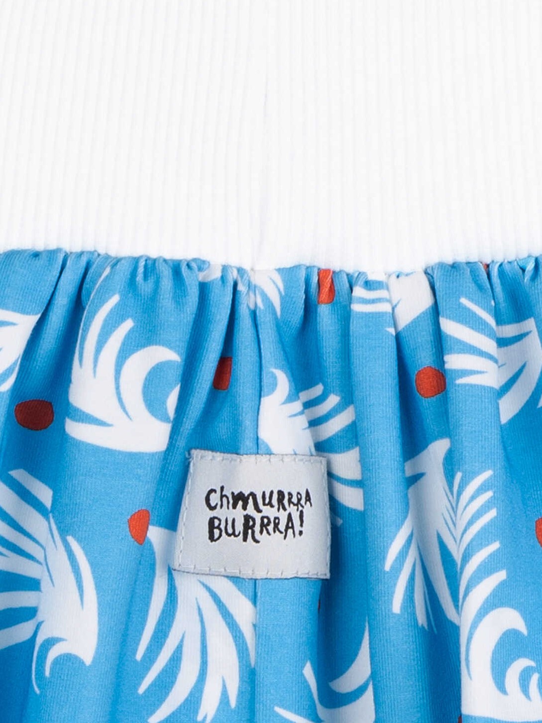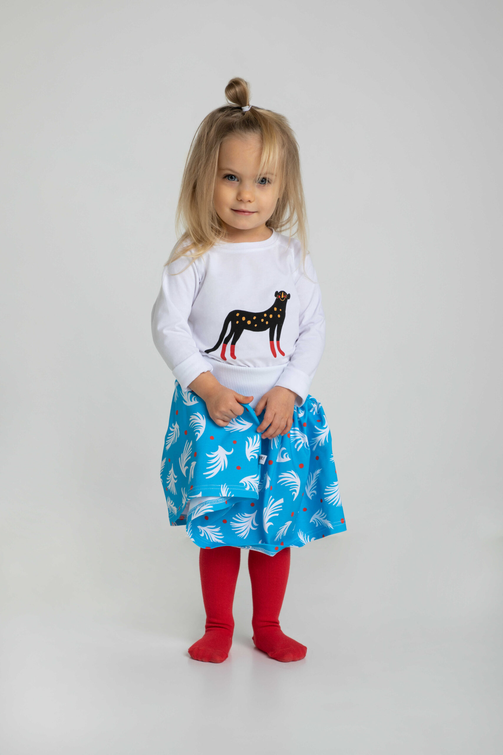 Błękitna spódniczka przed kolano lubi skupiać na sobie uwagę. Nic dziwnego, jej rozkloszowany krój jest wręcz stworzony do tańca! Spódniczka wykończona jest miękkim białym ściągaczem, który można również wywijać – co, kto lubi!