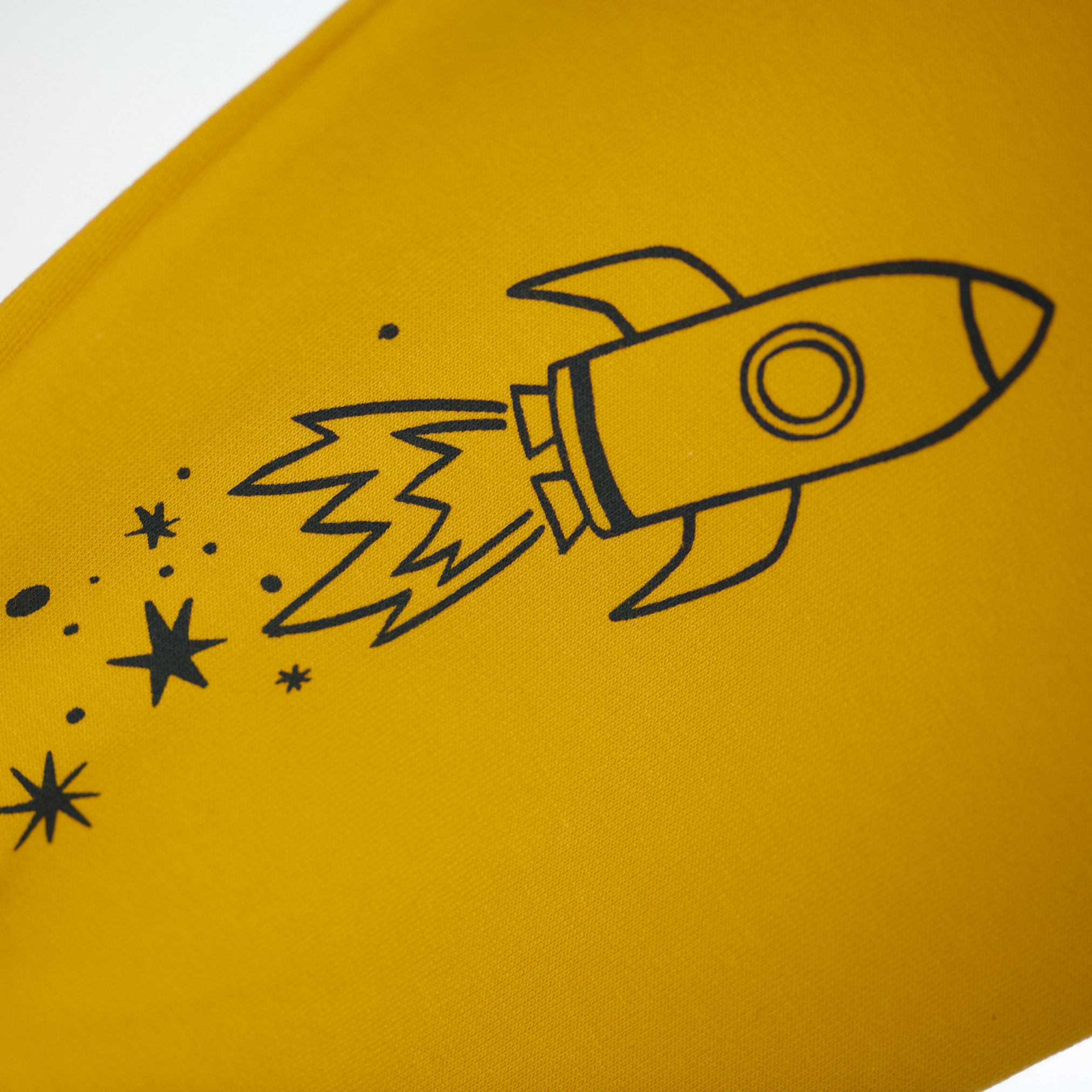 Musztardowe spodnie z wzorem rakiety na nogawce. Idealne na jesienno – zimowy czas.