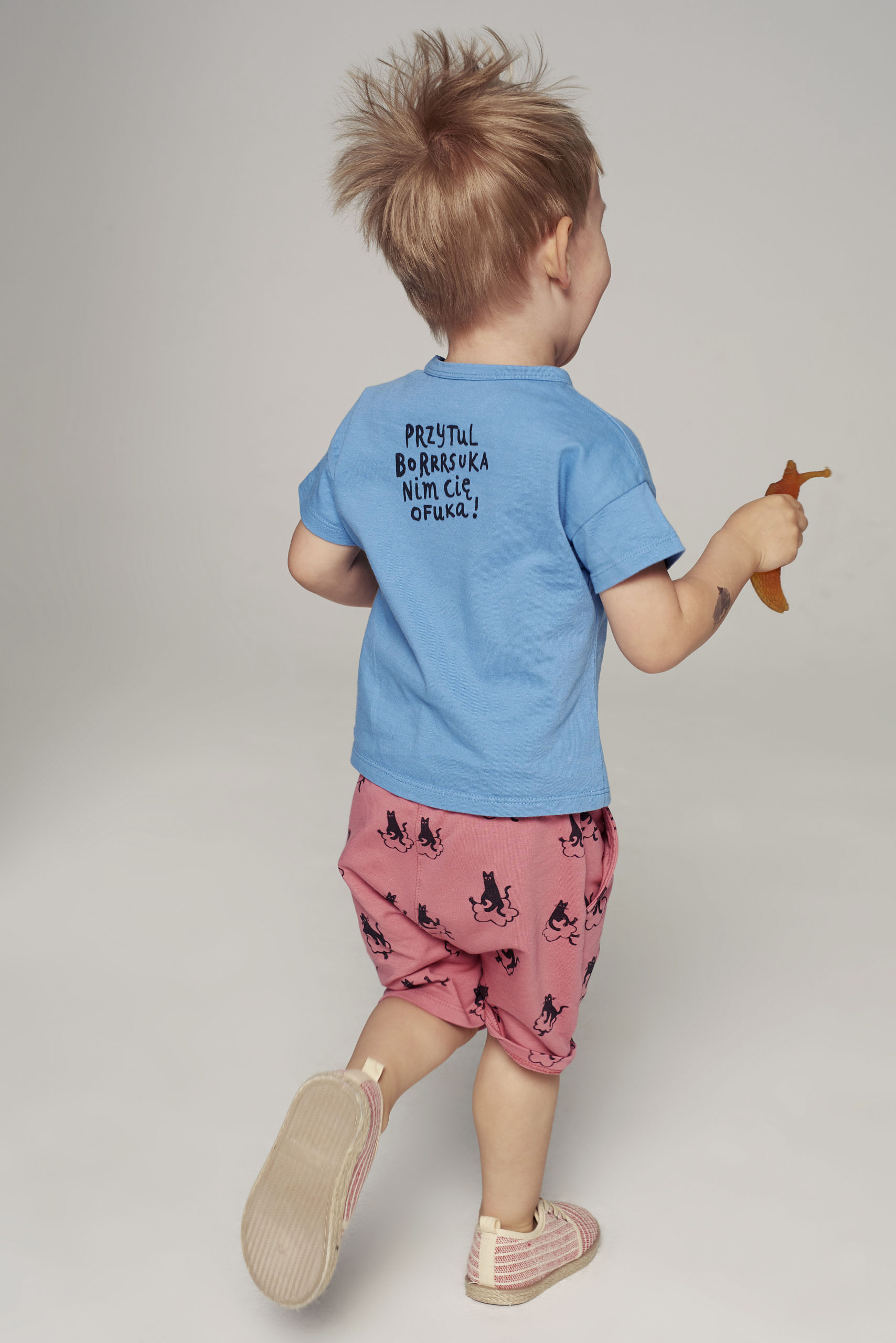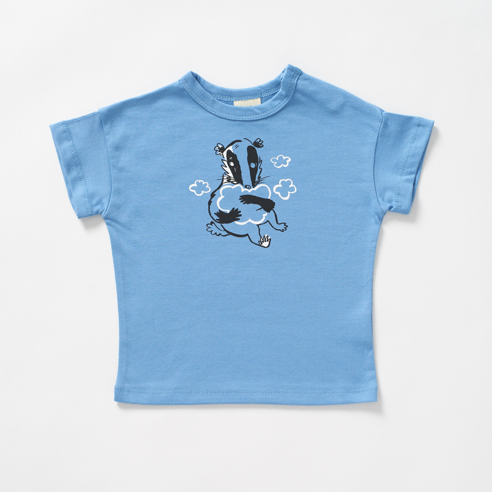 Niebieska koszulka z krótkim rękawkiem z sympatycznym borsukiem i wesołą rymowanką.