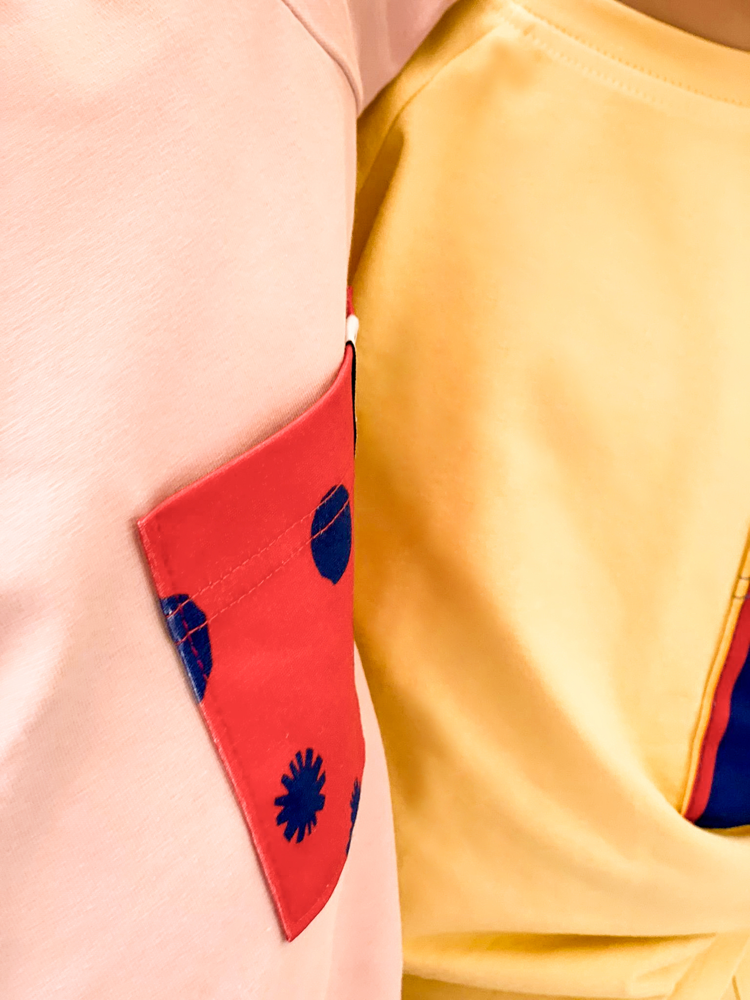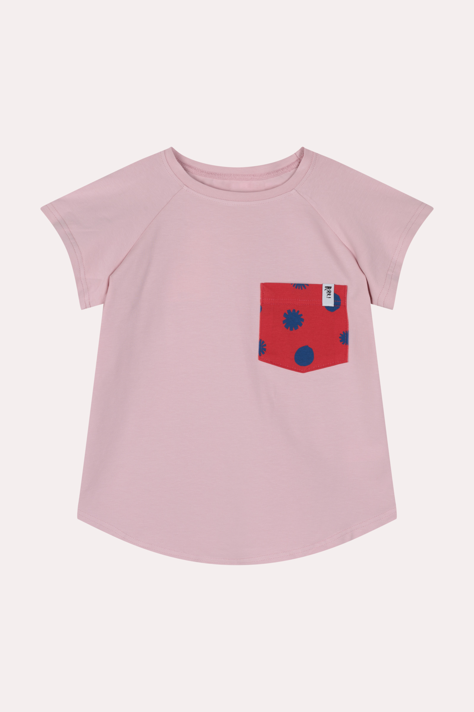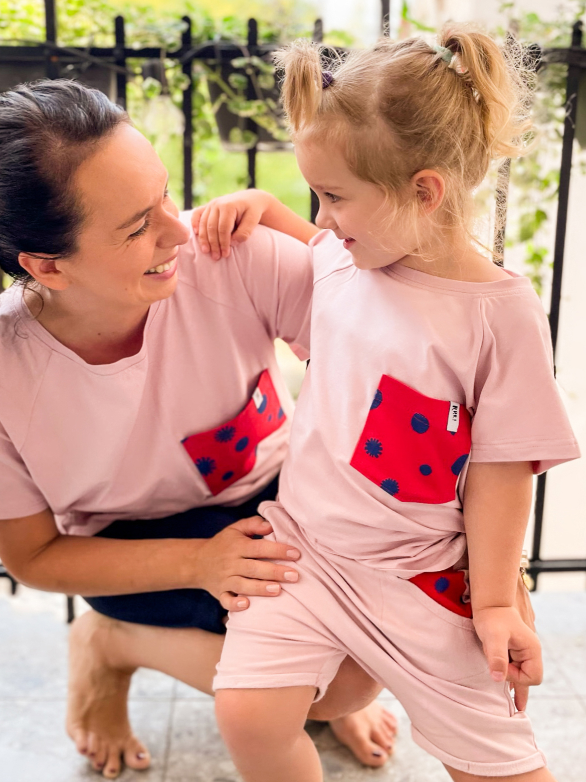 T-shirt o wydłużonym kroju dodatkowo podkręcony kieszonką z motywem czerwonych kropek. Jasnoróżowy odcień przywodzi na myśl truskawkowe lody. Nic dziwnego, że tak łatwo stracić głowę na jego punkcie! Dla małych i większych lodomaniaków.