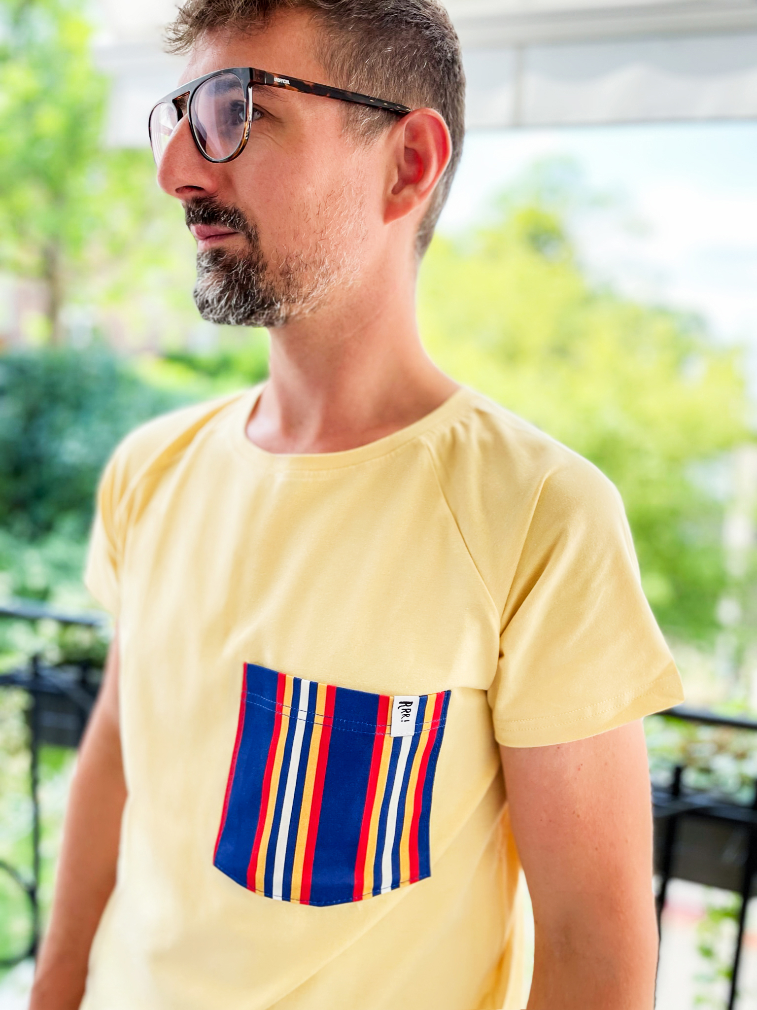 T-shirt żółty z kieszonką w paski dla dużych